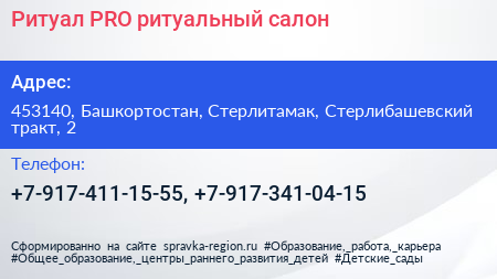 Ритуал PRO, ритуальный салон по адресу 453140, Башкортостан, Стерлитамак, Стерлибашевский тракт, 2 в дальнейшем Организация, размещена в следующих категориях: