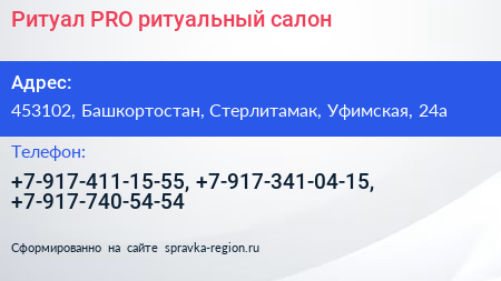 Ритуал PRO, ритуальный салон по адресу 453102, Башкортостан, Стерлитамак, Уфимская, 24а в дальнейшем Организация, размещена в следующих категориях: