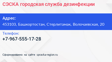 СЭСКА, городская служба дезинфекции по адресу 453103, Башкортостан, Стерлитамак, Волочаевская, 20 в дальнейшем Организация, размещена в следующих категориях: