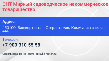 СНТ Мирный, садоводческое некоммерческое товарищество по адресу 453100, Башкортостан, Стерлитамак, Коммунистическая, 44Б в дальнейшем Организация, размещена в следующих категориях: