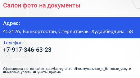 Салон фото на документы по адресу 453126, Башкортостан, Стерлитамак, Худайбердина, 58 в дальнейшем Организация, размещена в следующих категориях: