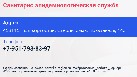 Санитарно-эпидемиологическая служба по адресу 453115, Башкортостан, Стерлитамак, Вокзальная, 14а в дальнейшем Организация, размещена в следующих категориях: