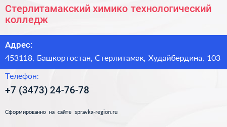 Стерлитамакский химико-технологический колледж по адресу 453118, Башкортостан, Стерлитамак, Худайбердина, 103 в дальнейшем Организация, размещена в следующих категориях: