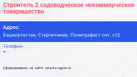 Строитель-2, садоводческое некоммерческое товарищество по адресу Башкортостан, Стерлитамак, Полиграфист снт, ст2 в дальнейшем Организация, размещена в следующих категориях: