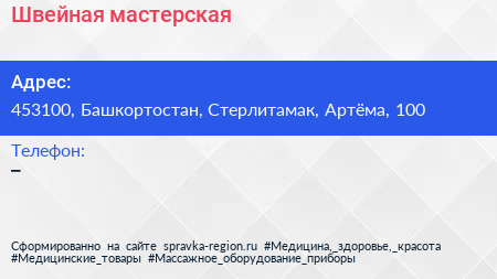 Швейная мастерская по адресу 453100, Башкортостан, Стерлитамак, Артёма, 100 в дальнейшем Организация, размещена в следующих категориях: