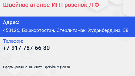Швейное ателье, ИП Грозенок Л.Ф. по адресу 453126, Башкортостан, Стерлитамак, Худайбердина, 58 в дальнейшем Организация, размещена в следующих категориях: