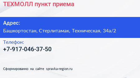 ТЕХМОЛЛ, пункт приема по адресу Башкортостан, Стерлитамак, Техническая, 34а/2 в дальнейшем Организация, размещена в следующих категориях: