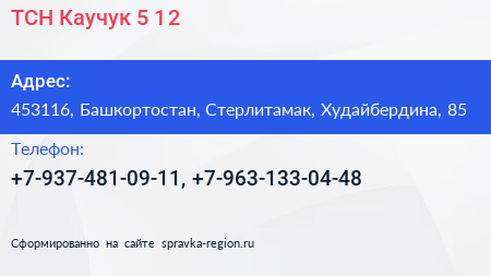 ТСН Каучук-5/1,2 по адресу 453116, Башкортостан, Стерлитамак, Худайбердина, 85 в дальнейшем Организация, размещена в следующих категориях: