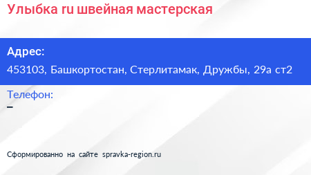 Улыбка.ru, швейная мастерская по адресу 453103, Башкортостан, Стерлитамак, Дружбы, 29а ст2 в дальнейшем Организация, размещена в следующих категориях: