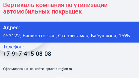 Вертикаль, компания по утилизации автомобильных покрышек по адресу 453122, Башкортостан, Стерлитамак, Бабушкина, 169Б в дальнейшем Организация, размещена в следующих категориях: