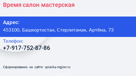 Время, салон-мастерская по адресу 453100, Башкортостан, Стерлитамак, Артёма, 73 в дальнейшем Организация, размещена в следующих категориях: