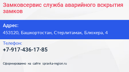 Замковсервис, служба аварийного вскрытия замков по адресу 453120, Башкортостан, Стерлитамак, Блюхера, 4 в дальнейшем Организация, размещена в следующих категориях: