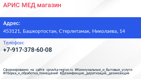 АРИС-МЕД, магазин по адресу 453121, Башкортостан, Стерлитамак, Николаева, 14 в дальнейшем Организация, размещена в следующих категориях: