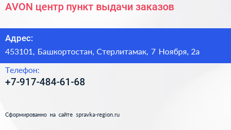AVON центр, пункт выдачи заказов по адресу 453101, Башкортостан, Стерлитамак, 7 Ноября, 2а в дальнейшем Организация, размещена в следующих категориях: