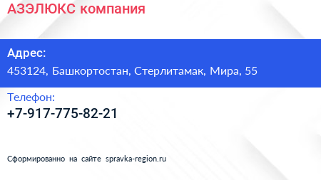 АЗЭЛЮКС, компания по адресу 453124, Башкортостан, Стерлитамак, Мира, 55 в дальнейшем Организация, размещена в следующих категориях:
