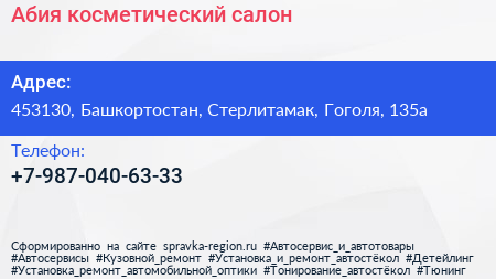 Абия, косметический салон по адресу 453130, Башкортостан, Стерлитамак, Гоголя, 135а в дальнейшем Организация, размещена в следующих категориях:
