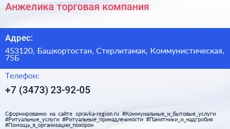 Анжелика, торговая компания по адресу 453120, Башкортостан, Стерлитамак, Коммунистическая, 75Б в дальнейшем Организация, размещена в следующих категориях: