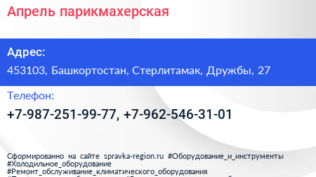 Апрель, парикмахерская по адресу 453103, Башкортостан, Стерлитамак, Дружбы, 27 в дальнейшем Организация, размещена в следующих категориях: