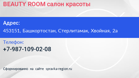 BEAUTY ROOM, салон красоты по адресу 453151, Башкортостан, Стерлитамак, Хвойная, 2а в дальнейшем Организация, размещена в следующих категориях: