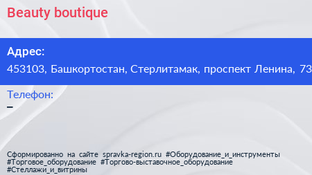 Beauty boutique по адресу 453103, Башкортостан, Стерлитамак, проспект Ленина, 73 в дальнейшем Организация, размещена в следующих категориях: