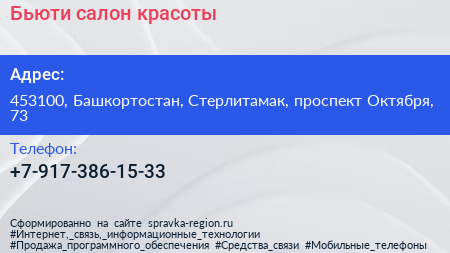 Бьюти, салон красоты по адресу 453100, Башкортостан, Стерлитамак, проспект Октября, 73 в дальнейшем Организация, размещена в следующих категориях: