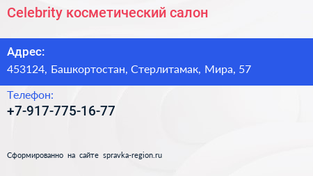 Celebrity, косметический салон по адресу 453124, Башкортостан, Стерлитамак, Мира, 57 в дальнейшем Организация, размещена в следующих категориях:
