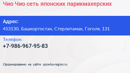 Чио Чио, сеть японских парикмахерских по адресу 453130, Башкортостан, Стерлитамак, Гоголя, 131 в дальнейшем Организация, размещена в следующих категориях: