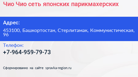 Чио Чио, сеть японских парикмахерских по адресу 453100, Башкортостан, Стерлитамак, Коммунистическая, 96 в дальнейшем Организация, размещена в следующих категориях: