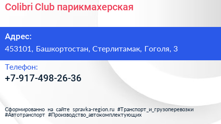 Colibri Club, парикмахерская по адресу 453101, Башкортостан, Стерлитамак, Гоголя, 3 в дальнейшем Организация, размещена в следующих категориях: