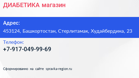 ДИАБЕТИКА, магазин по адресу 453124, Башкортостан, Стерлитамак, Худайбердина, 23 в дальнейшем Организация, размещена в следующих категориях: