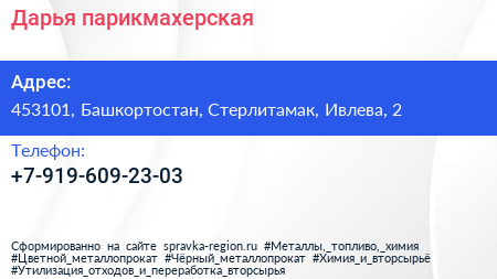 Дарья, парикмахерская по адресу 453101, Башкортостан, Стерлитамак, Ивлева, 2 в дальнейшем Организация, размещена в следующих категориях: