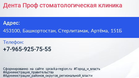 Дента-Проф, стоматологическая клиника по адресу 453100, Башкортостан, Стерлитамак, Артёма, 151Б в дальнейшем Организация, размещена в следующих категориях: