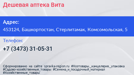 Дешевая аптека Вита по адресу 453124, Башкортостан, Стерлитамак, Комсомольская, 5 в дальнейшем Организация, размещена в следующих категориях: