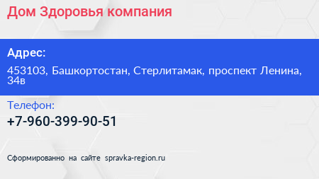 Дом Здоровья, компания по адресу 453103, Башкортостан, Стерлитамак, проспект Ленина, 34в в дальнейшем Организация, размещена в следующих категориях: