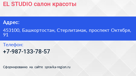 EL STUDIO, салон красоты по адресу 453100, Башкортостан, Стерлитамак, проспект Октября, 91 в дальнейшем Организация, размещена в следующих категориях: