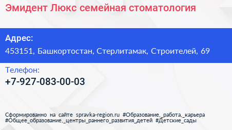 Эмидент Люкс, семейная стоматология по адресу 453151, Башкортостан, Стерлитамак, Строителей, 69 в дальнейшем Организация, размещена в следующих категориях: