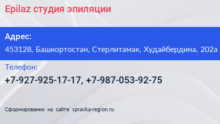 Epilaz, студия эпиляции по адресу 453128, Башкортостан, Стерлитамак, Худайбердина, 202а в дальнейшем Организация, размещена в следующих категориях:
