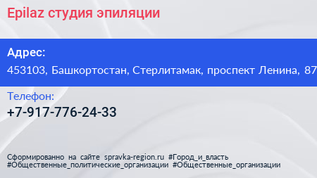 Epilaz, студия эпиляции по адресу 453103, Башкортостан, Стерлитамак, проспект Ленина, 87 в дальнейшем Организация, размещена в следующих категориях: