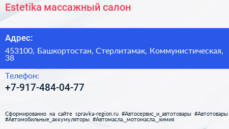 Estetika, массажный салон по адресу 453100, Башкортостан, Стерлитамак, Коммунистическая, 38 в дальнейшем Организация, размещена в следующих категориях: