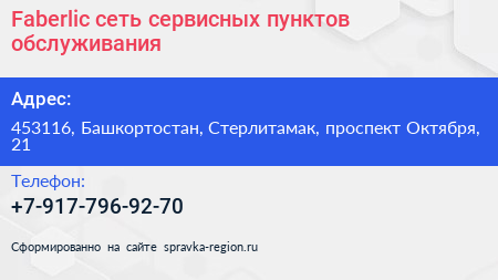 Faberlic, сеть сервисных пунктов обслуживания по адресу 453116, Башкортостан, Стерлитамак, проспект Октября, 21 в дальнейшем Организация, размещена в следующих категориях: