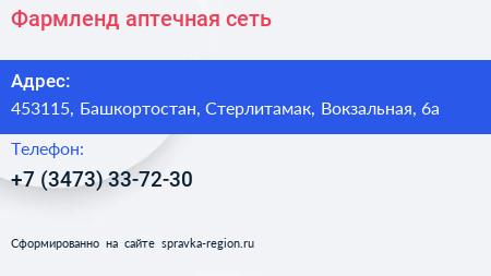 Фармленд, аптечная сеть по адресу 453115, Башкортостан, Стерлитамак, Вокзальная, 6а в дальнейшем Организация, размещена в следующих категориях: