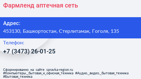 Фармленд, аптечная сеть по адресу 453130, Башкортостан, Стерлитамак, Гоголя, 135 в дальнейшем Организация, размещена в следующих категориях: