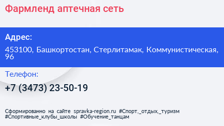 Фармленд, аптечная сеть по адресу 453100, Башкортостан, Стерлитамак, Коммунистическая, 96 в дальнейшем Организация, размещена в следующих категориях:
