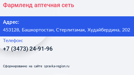 Фармленд, аптечная сеть по адресу 453128, Башкортостан, Стерлитамак, Худайбердина, 202 в дальнейшем Организация, размещена в следующих категориях: