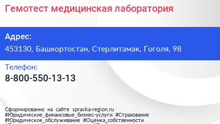 Гемотест, медицинская лаборатория по адресу 453130, Башкортостан, Стерлитамак, Гоголя, 98 в дальнейшем Организация, размещена в следующих категориях: