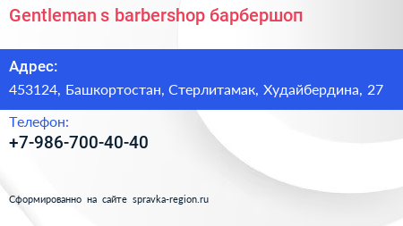 Gentleman`s barbershop, барбершоп по адресу 453124, Башкортостан, Стерлитамак, Худайбердина, 27 в дальнейшем Организация, размещена в следующих категориях: