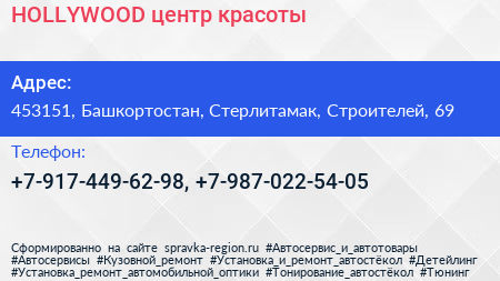 HOLLYWOOD, центр красоты по адресу 453151, Башкортостан, Стерлитамак, Строителей, 69 в дальнейшем Организация, размещена в следующих категориях: