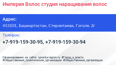 Империя Волос, студия наращивания волос по адресу 453101, Башкортостан, Стерлитамак, Гоголя, 2г в дальнейшем Организация, размещена в следующих категориях: