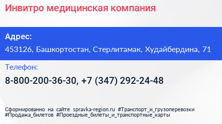Инвитро, медицинская компания по адресу 453126, Башкортостан, Стерлитамак, Худайбердина, 71 в дальнейшем Организация, размещена в следующих категориях: