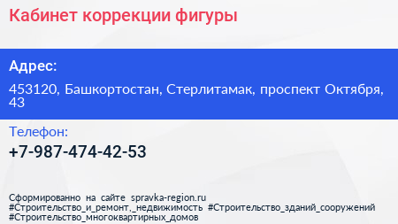 Кабинет коррекции фигуры по адресу 453120, Башкортостан, Стерлитамак, проспект Октября, 43 в дальнейшем Организация, размещена в следующих категориях:
